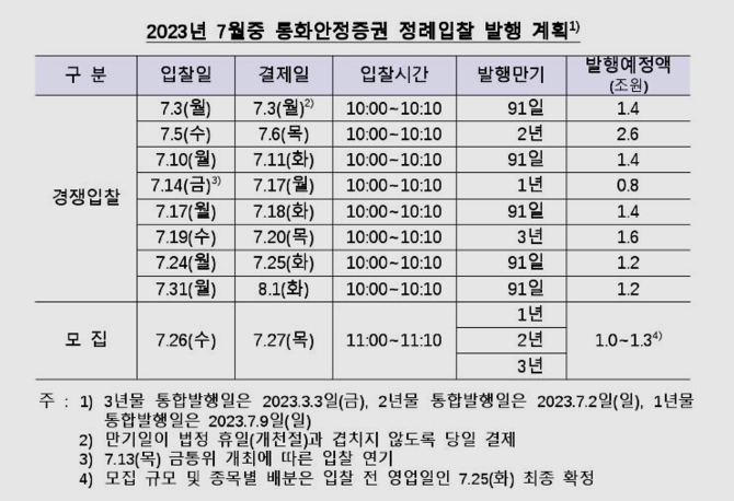 이달 발행 계획 물량보다 2조4천억원 늘어난 것으로, 11조6천억원은 경쟁입찰 방식으로, 1조∼1조3천억원은 모집 방식으로 발행될 예정이다.