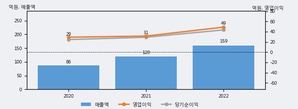 최근 실적을 살펴보면 2022년 매출액이 최근 3년 중 가장 높은 실적을 기록했음을 알 수 있다. 이전 최고 실적이었던 2021년 보다도 32.5%(38억 9천만원) 늘어난 것으로 나타났다.
