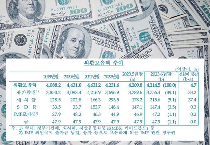 한국은행이 5일 발표한 외환보유액 통계에 따르면 6월 말 기준 외환보유액은 4천214억5천만달러(약 549조원)로, 5월 말(4천209억8천만달러)보다 4억7천만달러 증가했다.
