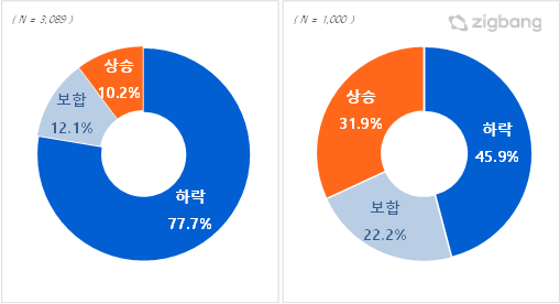 거주지역별로는 지방 5대 광역시 거주 응답자의 54.0%가 하락을 선택했으며 뒤이어 경기(46.2%), 인천(43.1%), 지방(42.4%), 서울(42.3%) 순이었다.