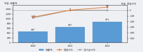최근 실적을 살펴보면 2022년 매출액이 최근 3년 중 가장 높은 실적을 기록했음을 알 수 있다. 이전 최고 실적이었던 2021년 보다도 32.5%(213억 5천만원) 늘어난 것으로 나타났다.