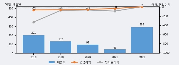 최근 실적을 살펴보면 2022년 매출액이 최근 5년 중 가장 높은 실적을 기록했음을 알 수 있다. 이전 최고 실적이었던 2018년 보다도 44.2%(88억 6천만원) 늘어난 것으로 나타났다.