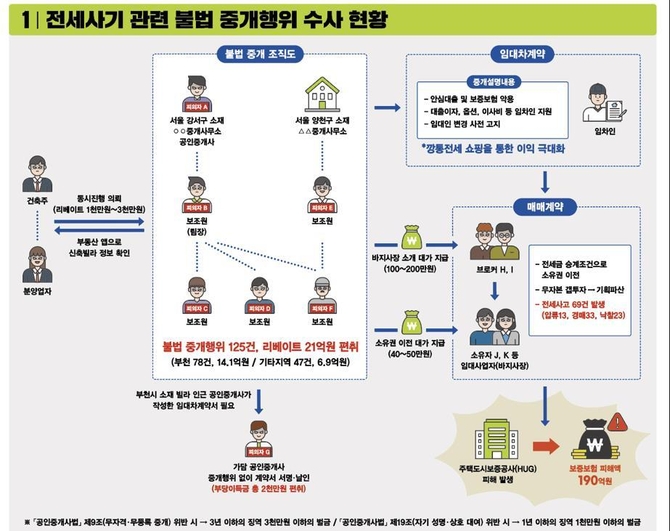 이 관계자는 "임차인들의 경우 불법 중개의 공범 혐의 입증이 어려워 입건하지는 않은 상태"라며 "수사 과정에서 발견된 전세사기, 보증보험사기 등 관련 의심 사항에 대해서는 검찰에 이송할 예정"이라고 덧붙였다.