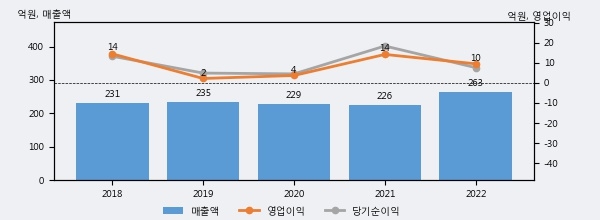 최근 실적을 살펴보면 2022년 매출액이 최근 5년 중 가장 높은 실적을 기록했음을 알 수 있다. 이전 최고 실적이었던 2019년 보다도 12.0%(28억 1천만원) 늘어난 것으로 나타났다.