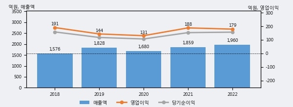 최근 실적을 살펴보면 2022년 매출액이 최근 5년 중 가장 높은 실적을 기록했음을 알 수 있다. 이전 최고 실적이었던 2021년 보다도 5.4%(101억 2천만원) 늘어난 것으로 나타났다.