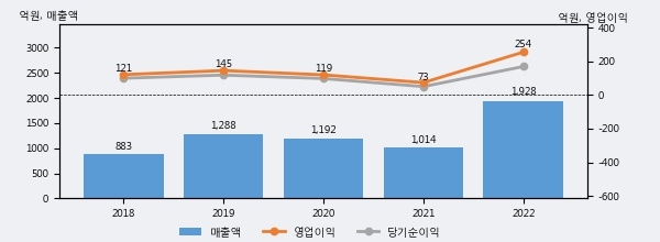 최근 실적을 살펴보면 2022년 매출액이 최근 5년 중 가장 높은 실적을 기록했음을 알 수 있다. 이전 최고 실적이었던 2019년 보다도 49.6%(639억 4천만원) 늘어난 것으로 나타났다.