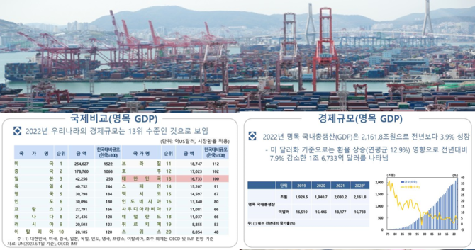 일본(253), 독일(244)은 2.5배 정도, 영국(184), 인도(180), 프랑스(166) 등도 우리나라 경제규모의 1.5배 이상이었다. 한국의 경제규모 순위는 2021년 10위에서 지난해 13위로 3계단 하락했다.
