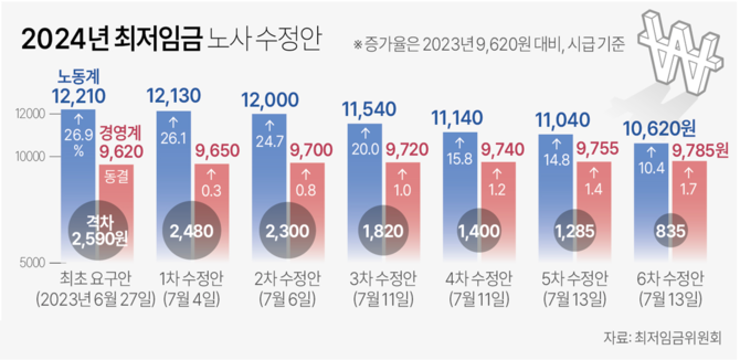 노동계와 경영계는 이날 오후 정부세종청사에서 열린 최저임금위원회 제13차 전원회의에서 내년도 최저임금 6차 수정 요구안으로 각각 1만620원, 9천785원을 제시했다.