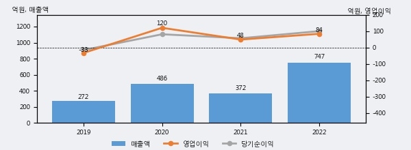 최근 실적을 살펴보면 2022년 매출액이 최근 4년 중 가장 높은 실적을 기록했음을 알 수 있다. 이전 최고 실적이었던 2020년 보다도 53.5%(260억 3천만원) 늘어난 것으로 나타났다.