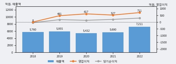 최근 실적을 살펴보면 2022년 매출액이 최근 5년 중 가장 높은 실적을 기록했음을 알 수 있다. 이전 최고 실적이었던 2019년 보다도 21.1%(1256억 3천만원) 늘어난 것으로 나타났다.