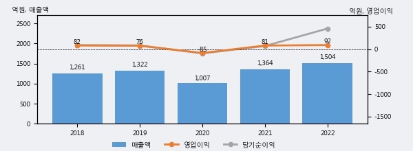 최근 실적을 살펴보면 2022년 매출액이 최근 5년 중 가장 높은 실적을 기록했음을 알 수 있다. 이전 최고 실적이었던 2021년 보다도 10.3%(139억 9천만원) 늘어난 것으로 나타났다.