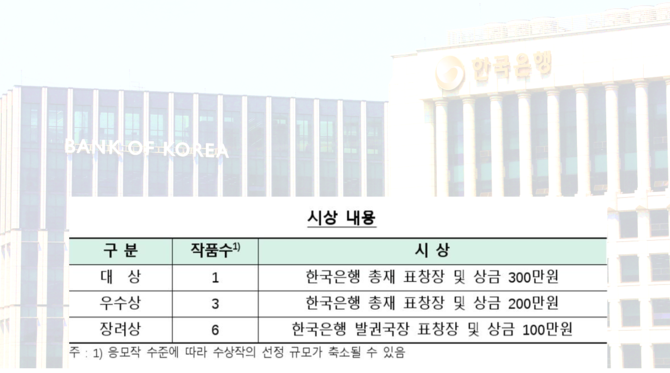 주제의 경우 위조화폐 유통 방지, 돈 깨끗이 쓰기, 동전 다시 쓰기, 현금 사용 선택권 보장 가운데 하나를 고를 수 있다. 우수작은 한은 총재 명의 포상과 함께 한은 홈페이지 등에 게시될 예정이다.