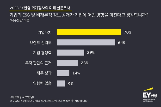 기업의 ESG 및 비재무적 정보 공개가 기업에 미치는 영향을 묻는 질문(중복응답)에 ‘기업가치’(70%)와 ‘브랜드 신뢰도’(64%)가 가장 높게 집계됐다.