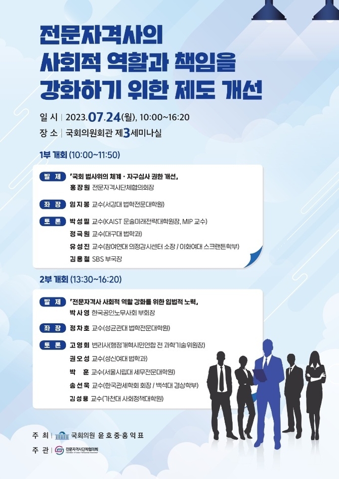 제 1부 주제로는 '국회 법사위의 체계·지구심사 권한 개선'을 논의 할 예정이며, 제 2부 주제로는 '전문자격사 사회적 역할 강화를 위한 입법적 노력'등을 논의하게 된다.