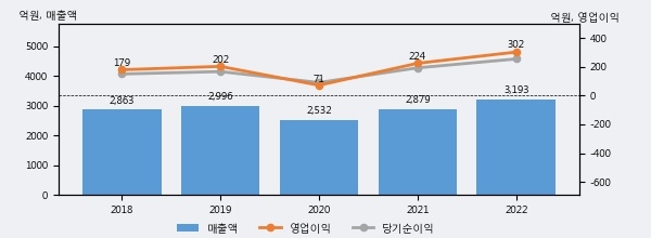 최근 실적을 살펴보면 2022년 매출액이 최근 5년 중 가장 높은 실적을 기록했음을 알 수 있다. 이전 최고 실적이었던 2019년 보다도 6.6%(197억 3천만원) 늘어난 것으로 나타났다.
