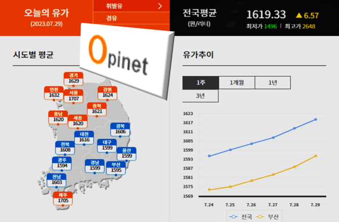 29일 한국석유공사 유가정보시스템 오피넷에 따르면 7월 넷째 주(23∼27일) 전국 주유소 휘발유 평균 판매 가격은 전주보다 15.7원 오른 L당 1천599.3원을 기록했다.