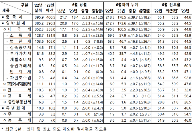 기획재정부가 31일 공개한 6월 국세 수입 현황 확정치에 따르면, 올해 1~6월 국세 수입은 178조5000억원으로 지난해 같은 기간보다 39조7000억원(18.2%) 덜 걷혔다.