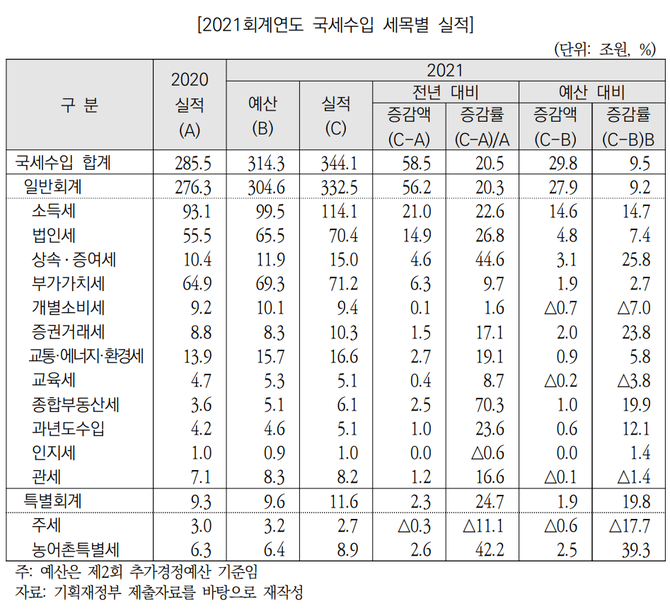 전년 대비 소득세 21.0조원, 법인세 14.9조원, 부가가치세 6.3조원, 상속증여세 4.6조원, 종합부동산세 2.5조원, 증권거래세 1.5조원이 각각 증가했다.