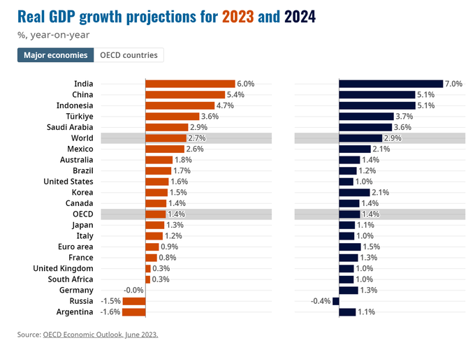 통상적인 한국의 잠재성장률은 2%인 반면, OECD의 2023년 한국 경제성장 전망치는 1.5%로 OECD 평균(1.4%)보다 약간 높은 수준에 불과하다. 한국은행의 5월 전망치(1.4%)도 긍정적이지 않다.