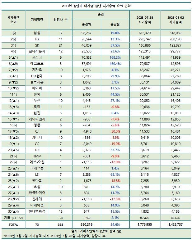 1일 기업분석연구소 리더스인덱스가 대기업 집단 중 상장사를 보유한 73개 그룹의 338개 상장사 시총을 분석한 결과 7월 28일 종가 기준 1천773조9천550억원으로 연초인 1월 2일(1천423조7천366억원)보다 350조2천184억원(24.6%) 증가했다.