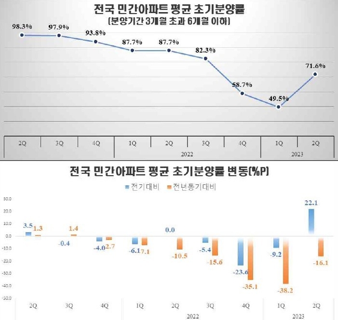 초기 분양률은 분양 개시일 이후 경과 기간이 3개월 초과∼6개월 이하인 총 분양 가구 수 대비 계약 체결 가구 수를 집계한 비율을 말한다. 매 분기 분양가구 수 30가구 이상 아파트를 전수조사해 산출한다.