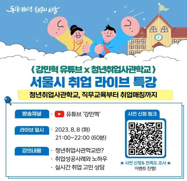 (조세금융신문=최주현 기자) 서울시는 오는 8일 오후 9시 취업 라이브 특강 '취업까지 한 번에 가는 청년취업 사관학교'를 유튜브 '강민혁' 채널에서 방송한다.