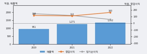 최근 실적을 살펴보면 2022년 매출액이 최근 3년 중 가장 높은 실적을 기록했음을 알 수 있다. 이전 최고 실적이었던 2021년 보다도 6.4%(81억 2천만원) 늘어난 것으로 나타났다.