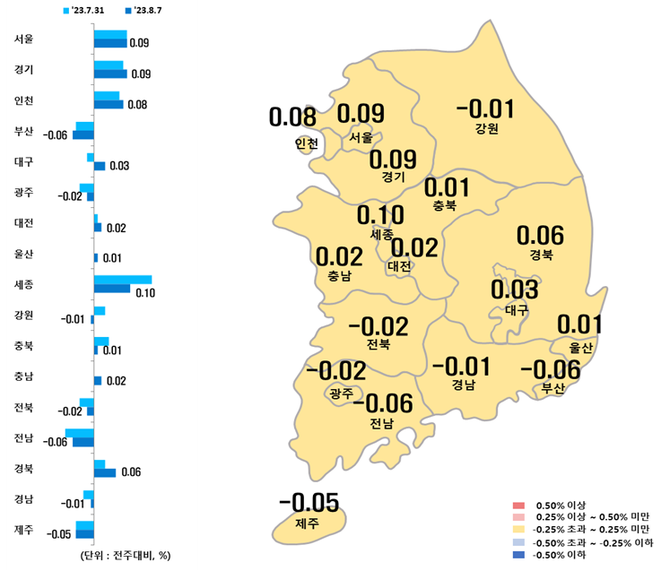 경기(0.09%)에서는 동두천시(-0.45%)는 지행·생연동 중저가 위주로, 구리시(-0.21%)는 인창·교문동 구축 위주로 하락세를 보였다. 반면 하남시(0.50%)는 미사신도시 (준)신축 위주로, 과천시(0.46%)는 부림·별양동 대단지 위주로 상승폭이 확대됐다.