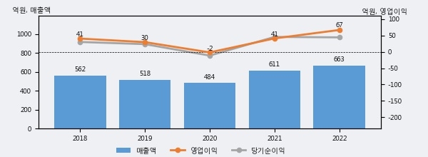 최근 실적을 살펴보면 2022년 매출액이 최근 5년 중 가장 높은 실적을 기록했음을 알 수 있다. 이전 최고 실적이었던 2021년 보다도 8.6%(52억 4천만원) 늘어난 것으로 나타났다.
