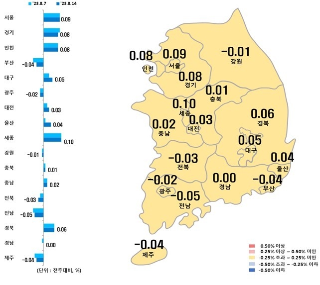 경기(0.09%→0.11%)는 상승폭 확대, 인천(0.04%→0.03%)은 상승폭이 줄었다. 5대광역시(-0.02%)와 8개도(-0.01%)는 하락했다.