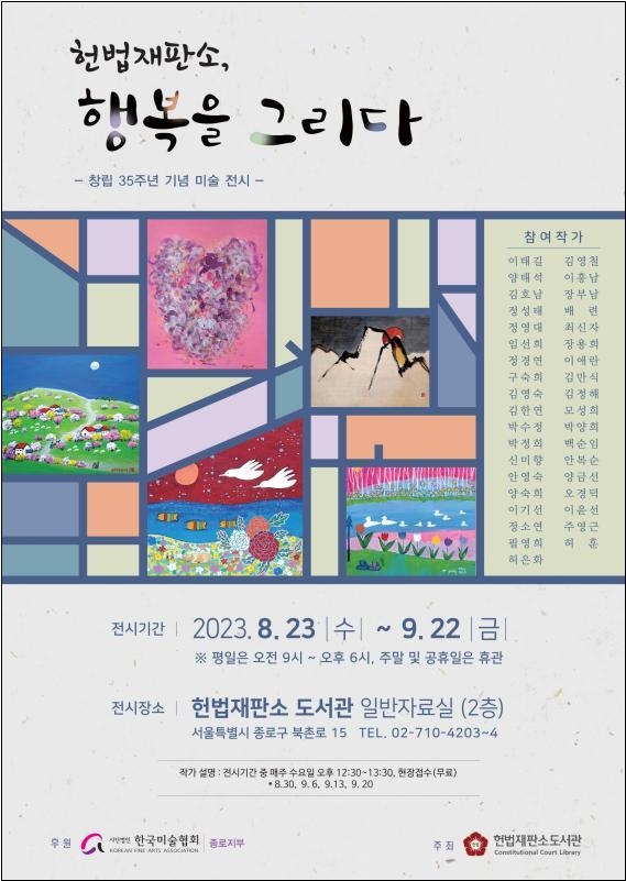 (조세금융신문=최주현 기자) 헌법재판소가 오늘(23일)부터 내달 22일까지 헌재 도서관에서 창립 35주년 맞이 '헌법재판소, 행복을 그리다' 미술 전시회를 개최한다.