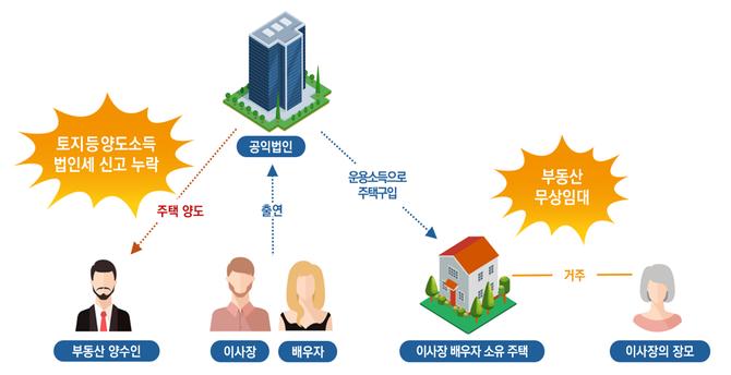 공익법인 C는 이사장 장모가 거주하고 있는 배우자 소유 아파트를 공익법인 돈으로 샀다. 그리고는 그 아파트를 그대로 장모에게 공짜로 빌려줬다.