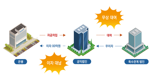 B가 은행에서 거액의 대출을 받은 후 그 대출금을 공짜로 법인 丙에 빌려줬다. 공익법인이 특수관계법인의 이자를 대신 내준 셈이다. 이는 특수관계자 부당지원을 통한 고의로 이익 낮추기에 해당, 국세청으로부터 법인세 탈루 검증을 받고 있다.