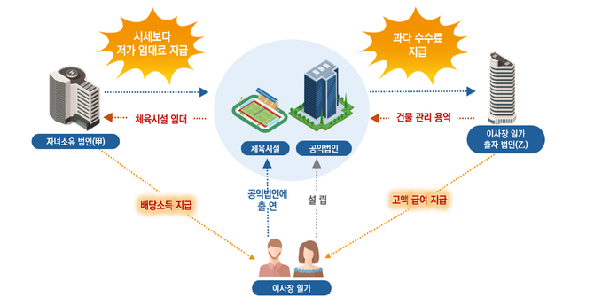 낮은 임대료는 고스란히 배당 형태로 자녀 호주머니에 들어갔고, 이사장 일가는 일가 소유의 건물관리 회사 乙법인을 통해 건물관리비 명목으로 고액의 돈을 기부 건물에서 뽑아갔다.