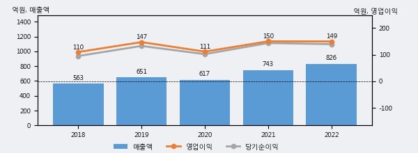 최근 실적을 살펴보면 2022년 매출액이 최근 5년 중 가장 높은 실적을 기록했음을 알 수 있다. 이전 최고 실적이었던 2021년 보다도 11.2%(83억 1천만원) 늘어난 것으로 나타났다.