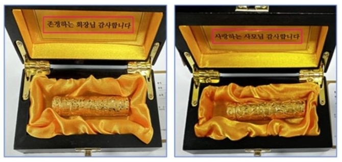 황금도장이 담긴 상자에는 ‘존경하는 회장님 감사합니다’, ‘사랑하는 사모님 감사합니다’라는 문구가 적혀있었다.