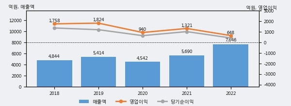 최근 실적을 살펴보면 2022년 매출액이 최근 5년 중 가장 높은 실적을 기록했음을 알 수 있다. 이전 최고 실적이었던 2021년 보다도 34.4%(1955억 9천만원) 늘어난 것으로 나타났다.