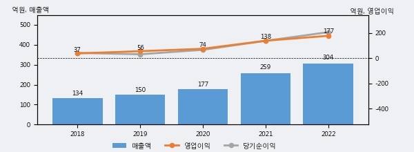 남화산업의 2022년 매출액은 전년대비 17.6% 늘어난 304억원이고, 영업이익 또한 전년대비 28.1% 늘어난 177억원을 기록했다. 이 회사의 매출액 증감률과 영업이익 증감률은 각각 코스닥 상위 40%, 상위 38%에 해당된다.