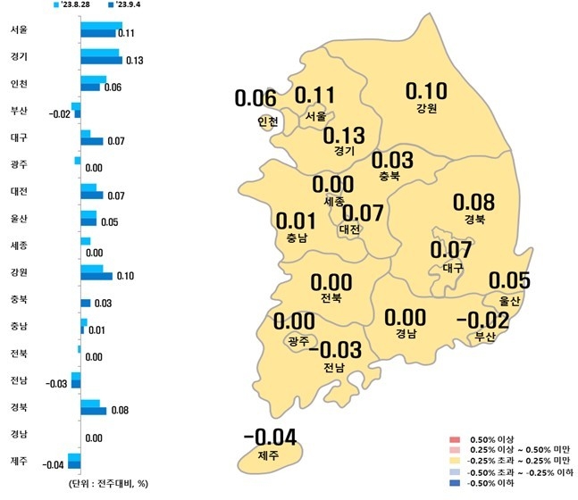 경기(0.12%→0.13%)는 상승폭이 소폭 확대됐다. 김포시(-0.08%)와 동두천시(-0.05%), 이천시(-0.04%)는 상승폭이 하락했지만 과천(0.40%), 용인(0.14%), 수원(0.15%) 등이 상승폭을 키우며 경기도 상승세를 견인했다.