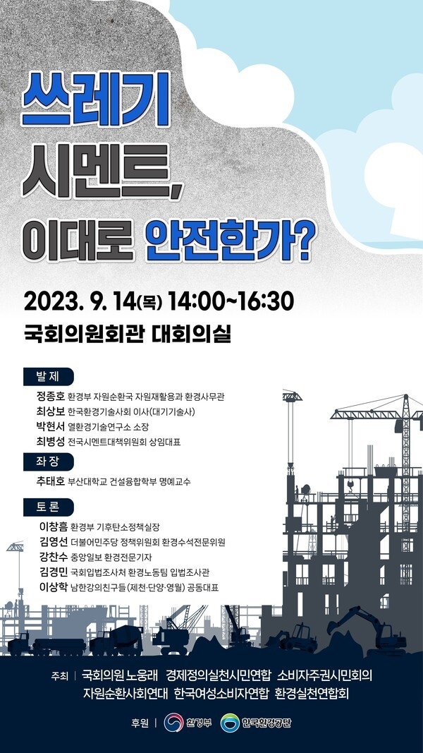 국회 환경노동위원회 소속 노웅래 더불어민주당 의원은 이날 ‘쓰레기시멘트, 이대로 안전한가?’ 정책토론회를 개최한다.