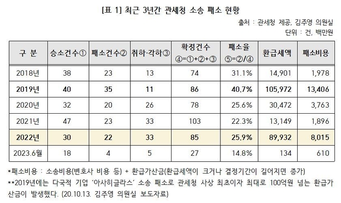 국회 기획재정위원회 소속 김주영(더불어민주당) 의원은 지난 19일 관세청으로부터 제출받은 ‘최근 5년간 소송패소 및 패소비용 현황’을 확인한 결과 2022년 한해 총 환급세액은 899억 3200만원, 패소비용은 80억 1500만원에 달했다고 밝히고, "관세청이 사전에 패소유형을 파악하는 것 뿐만 아니라 과세 시스템을 최신화하는 등 선제적으로 대비해야 한다"고 지적했다.