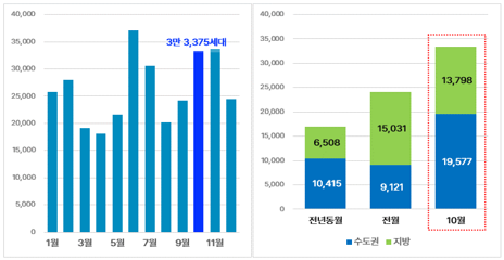 지역별로 보면 경기는 1만174가구로 10월 도시별 물량 중 가장 많고 인천은 7515가구가 입주해 전월보다 4배 이상 물량이 증가한다. 경기는 성남시와 화성시에서, 인천은 부평과 검단, 송도에서 대규모 단지들의 입주가 진행될 예정이다.