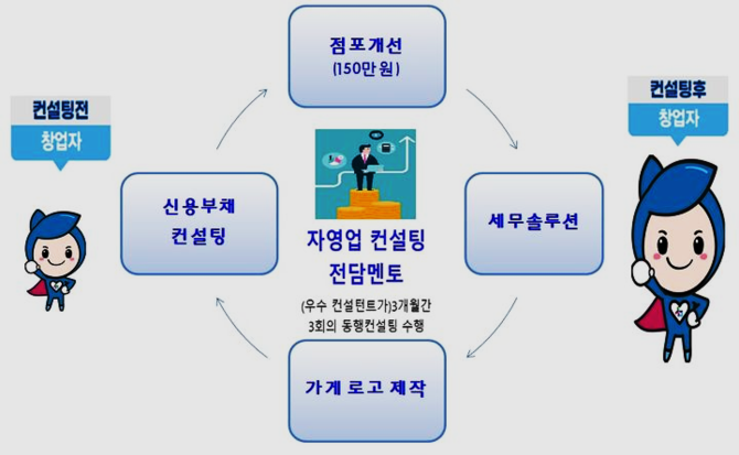 10월 초부터 약 3개월간 경영 노하우를 갖춘 우수 자영업 컨설턴트가 일대일 동행 컨설팅을 제공하고 분야별 다양한 전문가와 연계해 신용·부채관리 컨설팅, 세무 상담, 가게로고 제작 등 사업 안정화에 필수적인 요소들을 지원한다.