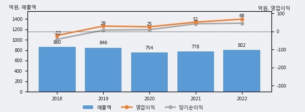 NE능률은 2022년 매출액 802억원과 영업이익 68억원을 기록했다. 전년대비 매출은 3.1%, 영업이익은 32.0% 각각 상승했다. 이 회사의 매출액 증감률과 영업이익 증감률은 각각 코스닥 하위 33%, 상위 36%에 해당된다.