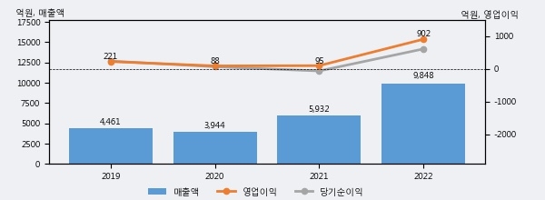 최근 실적을 살펴보면 2022년 매출액이 최근 4년 중 가장 높은 실적을 기록했음을 알 수 있다. 이전 최고 실적이었던 2021년 보다도 66.0%(3916억 5천만원) 늘어난 것으로 나타났다.