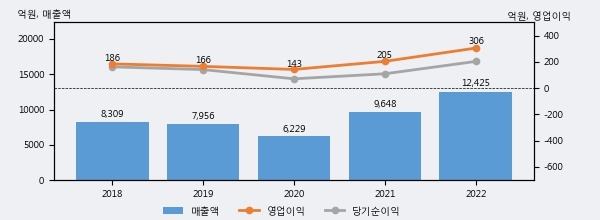 최근 실적을 살펴보면 2022년 매출액이 최근 5년 중 가장 높은 실적을 기록했음을 알 수 있다. 이전 최고 실적이었던 2021년 보다도 28.8%(2776억 5천만원) 늘어난 것으로 나타났다.