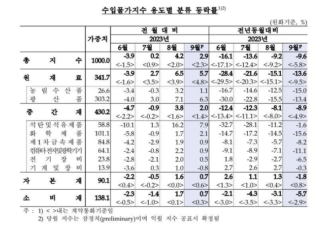 전월 대비 수입물가지수는 7월(0.2%) 상승 전환한 후 석 달 연속 올랐으나, 상승 폭은 8월(4.2%)보다 둔화했다. 다만 1년 전과 비교하면 9.6% 내려 하락세를 지속했다.