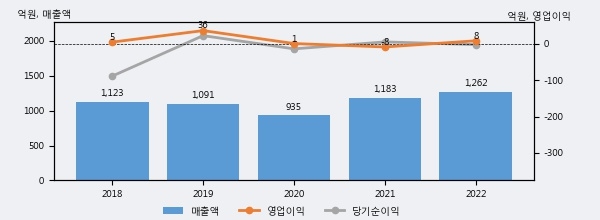 최근 실적을 살펴보면 2022년 매출액이 최근 5년 중 가장 높은 실적을 기록했음을 알 수 있다. 이전 최고 실적이었던 2021년 보다도 6.7%(78억 9천만원) 늘어난 것으로 나타났다.