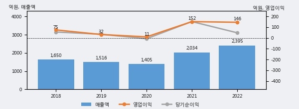 최근 실적을 살펴보면 2022년 매출액이 최근 5년 중 가장 높은 실적을 기록했음을 알 수 있다. 이전 최고 실적이었던 2021년 보다도 17.7%(360억 6천만원) 늘어난 것으로 나타났다.