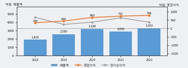 최근 실적을 살펴보면 2022년 매출액이 최근 5년 중 가장 높은 실적을 기록했음을 알 수 있다. 이전 최고 실적이었던 2020년 보다도 2.3%(74억 7천만원) 늘어난 것으로 나타났다.